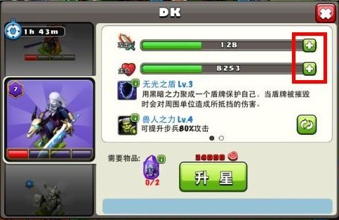 英雄等级需达到紫色超神6星可开启“加黄点”功能,在英雄属性界面可点击“+”进行操作(下图红框位置),每强化一次需消耗对应的蓝色结晶1个。