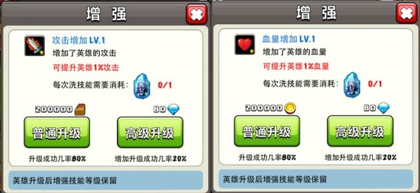 攻击强化,普通升级消耗20万木材,每一级会提升该英雄1%的攻击,最高可到100级