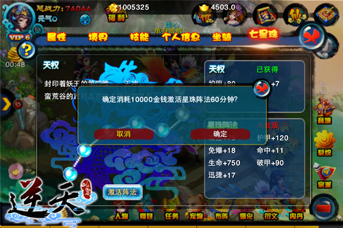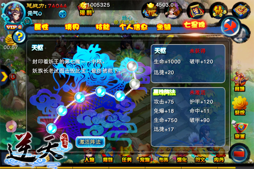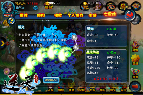 虽然七星珠封印着妖王,每一颗都蕴含着巨大的妖王法力,但它们都需要玩家在游戏中通过做主线任务来获得。而当你获得每一颗星珠后,就可以花费10000的金钱来激活由七星珠所组成的天罡北斗阵法,进而获得各项属性的提高,效果将持续60分钟,这已经足够让你在PK战斗中傲视群雄。