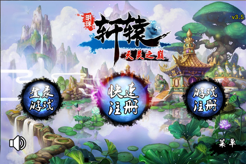 在《明珠轩辕》V3.5版的登陆界面上,可以看到在“轩辕”这两个水墨行书大字的右下角,以红色小字标明的最新资料片名称“天灵之巅”。同时,游戏界面处还有3个大大的圆形按钮,从左到右依次是:登录游戏、快速注册、游戏注册。左下是音量开关,可以开启与关闭音量,右下是菜单,可以看到掌上明珠的客服信息与游戏版本号。