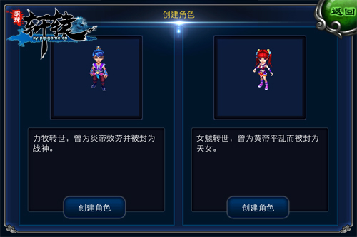 首次登录游戏之后,你可以选择创建男性角色或女性角色。其中男性的橘色是力牧转世,曾为炎帝效劳并被封为战神。而女性角色则是女魃转世,曾为黄帝平乱而被封为天女。