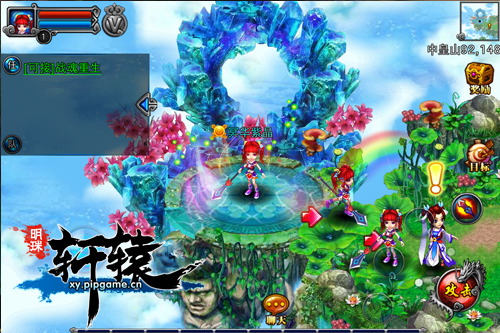 进入游戏,可以看到明珠游戏的logo——“Pipgame”,其中P这个英文字母以中国古代的发明七巧板+渐变色作为设计背景,十分好看,下面则是“明珠游戏”这4个汉字。Logo之后,即切换到游戏的登陆界面,流水潺潺,亭台轩榭,呈现出一片仙境般的世外景象。