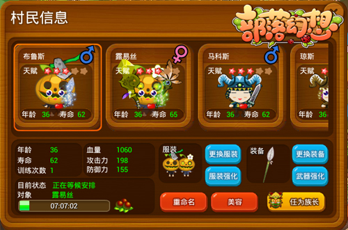 每个部落族员都有自己寿命,当你舍不得你的族员离你而去的时候,使用复活石可以让他们重新复活,而回春药剂则可以让100岁以后的族员恢复到18岁的妙龄哦,并且体力值将保持不变。这样,你心爱的族员就可以永远跟随在你的左右啦。