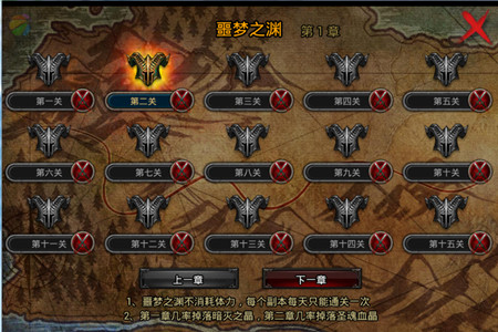 玩家在25级时可以开启“噩梦之渊”副本,副本目前一共分为两章,第一章有15个关卡,每个关卡都有大量实力超群的妖魔镇守,玩家需要依靠自己的装备和技巧才能战胜它们。通关之后便会获得大量奖励,包括金币、战勋、强化石、洗练石等,还有一定几率获得暗灭血晶或圣魂血晶,通过血晶可以将橙装升级成神装,5的倍数关卡必定会获得以上物品。