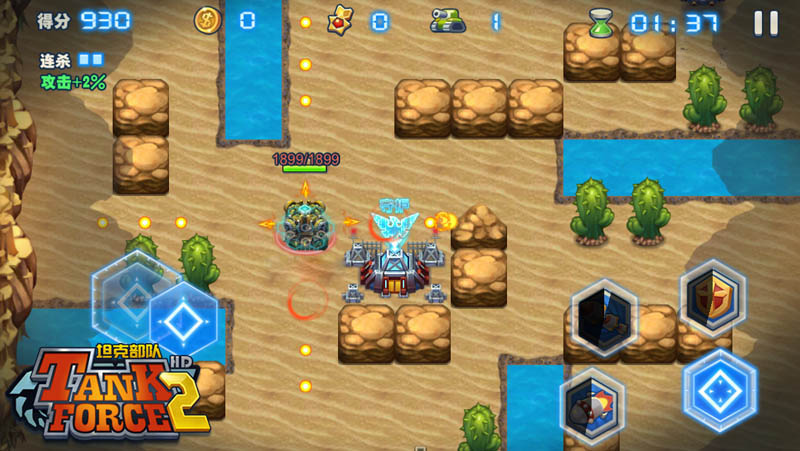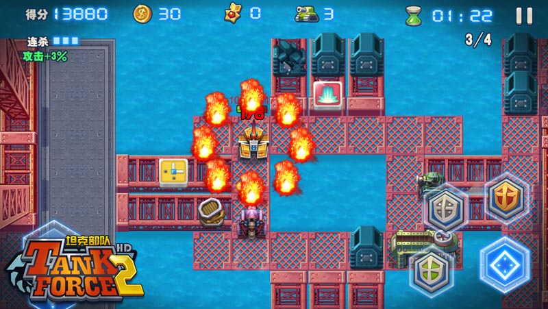 十字堡垒拥有《坦克部队2》中最均衡的属性:攻击力不俗,防御力也不错,移动速度属于中游水平,还自带连续射击的主动技能。因为十字堡垒给人的感觉就是踏实,任何场景和关卡都很实用。十字堡垒最大的特点是它的四向攻击能力,能同时攻击四个方向,开启技能连续射击之后,绝对称得上威风四面。