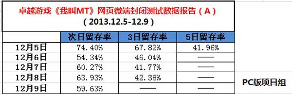 最新消息,卓越游戏进军PC市场的首款作品“《我叫MT》PC版”于12月9日0:00完成了封闭测试。随后,卓越游戏官方发布了一份有关本次测试的有关数据报告(部分)。其中,《我叫MT》封测的次日留存为79.4%。