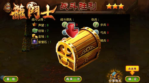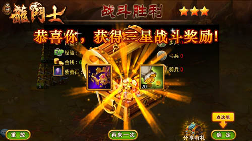 每个副本,第一次获得三星战斗奖励,酒会奖励一个宝箱。宝箱里可以开出升级君主爵位必须的破碎皇冠以及金钱、钻石、符文等宝物。亲爱的龙斗士们,赶快到副本中探险,大显身手吧!