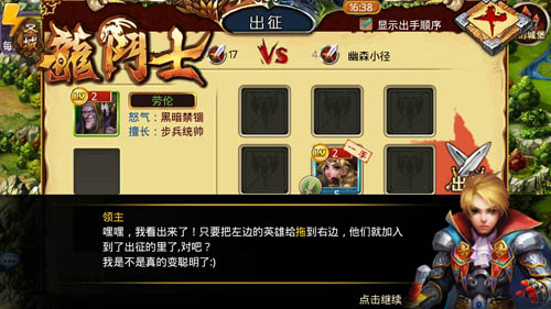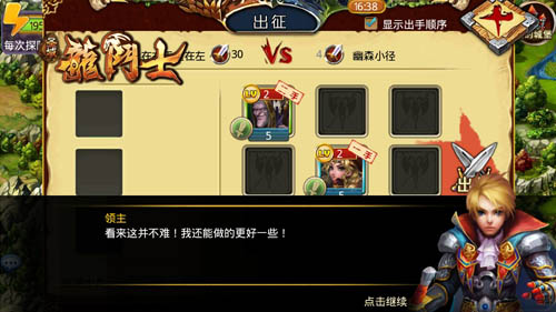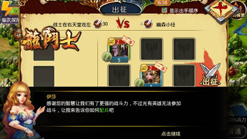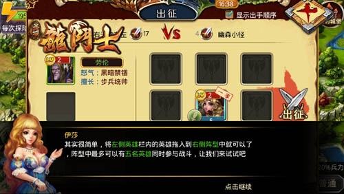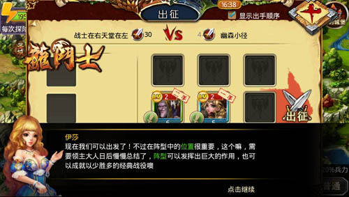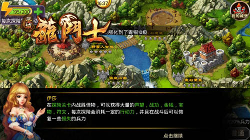 在这里,小助手伊莎还非常贴心的提醒我们。只要在探险关卡内战胜怪物,就可以获得大量的声望、战功、金钱、宝物、符文。但是每一次探险,都会消耗一定的行动力(通常是5点),战斗之后可以恢复一些损失的兵力。这在君主们游戏的初期非常有利,因为大家的资源都用来建造建筑,用于探险的资源本来就非常紧张,每一点资源都弥足珍贵。