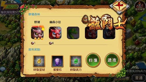 本次任务的目标地点,是“幽森小径”,我们先来了解一下通关可能获得的宝物。除了在野猪林里面出现过的紫萤石,增加15伤害的碎裂残忍和增加7点血量的碎裂活力是我们第一次见到的符文。为了宝物,龙斗士们冲吧!虽然“幽森小径”的守关怪物只有4点战力,但是作为通关控的我们,是必须要拿到三星奖励的人。一定要一丝不苟倍加小心,不能在阴沟翻船。