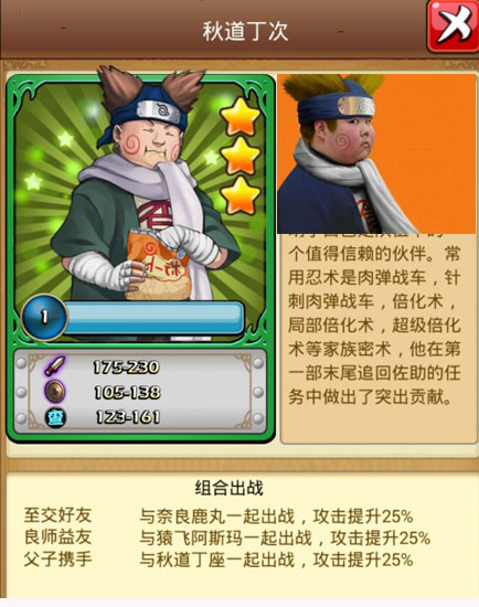 秋道丁次必须是《火影大人》中最出名的胖子忍者了,他是猿飞阿斯玛第十班的其中一名队员,并且跟系统开始赠送的忍者卡牌之一鹿丸是好朋友,两位忍者卡牌一起上阵就能够触发组合加成。丁次擅长倍化术,也就是将脂肪转换成查克拉,变瘦变胖,变大变小就在一念之间,真是薛定谔的胖子。他的经典语录:我不是死肥猪!我只是比较丰满而已!
