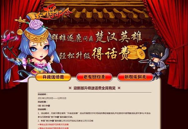 今日中午11:00整,《众将听令》第二大篇章“楚汉争霸”将全面更新并同步开启新服!同时总奖金达到5W元的超值回馈活动“迎新版升级送话费全民有奖”也在官网活动页面正式开始,欢迎各位新老玩家参与活动,先到先得,领完为止!!!
