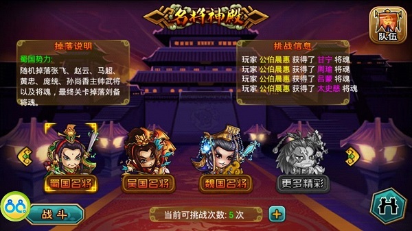 其次“名将神殿”功能开放。“名将神殿”分多个势力,分别掉落势力所属的武将、主帅以及将魂,总共有九波怪物的攻击,在打掉第九波怪物的攻击之后,会掉落对应势力所属的主公角色武将的紫色帅魂。