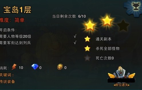 在游戏当中,宝岛副本要求限制不大,普通的玩家们都是可以进入的,宝岛一层需要20级,宝岛2层需要30级,宝岛3层需要40级;第二点,进入宝岛副本需要军衔达到列兵,所有的玩家只要参加过一次战场军衔都不会低于列兵的哦;第三点进入宝岛副本需要消耗10点体力值;第四点,宝岛开始时间为12点到22点之间。