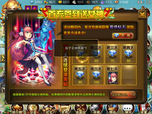 没错,无论新老玩家,从今天起,连续签到7天即可。不但在前6天将每天获得海量钻石奖励,在第7天更有5刀盾双子女神赠送。无论是每天开5000个魔盒苦寻金色五刀盾摩羯女神的高富帅,还是每日积累活跃度使用女神之泪兑换女神的屌丝。大家都可以很轻松的获得星座女神啦!