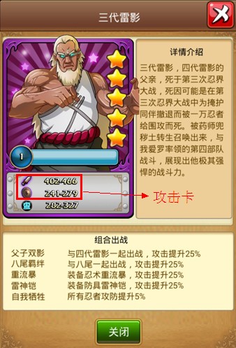 游戏中,新手玩家可能会遇到这样的情况,即拿到两张属性不一样的忍者卡牌。这是因为在《火影大人》中,每个人物卡牌都有攻击卡与防御卡两种属性,鉴别可以从卡牌的具体数值的大小看出其属于哪个类型,也可以从卡牌组合文字介绍得知。卡牌中另一个属性查克拉,则是关系到战斗中忍术施放的加成伤害,但忍术是有施放概率的。