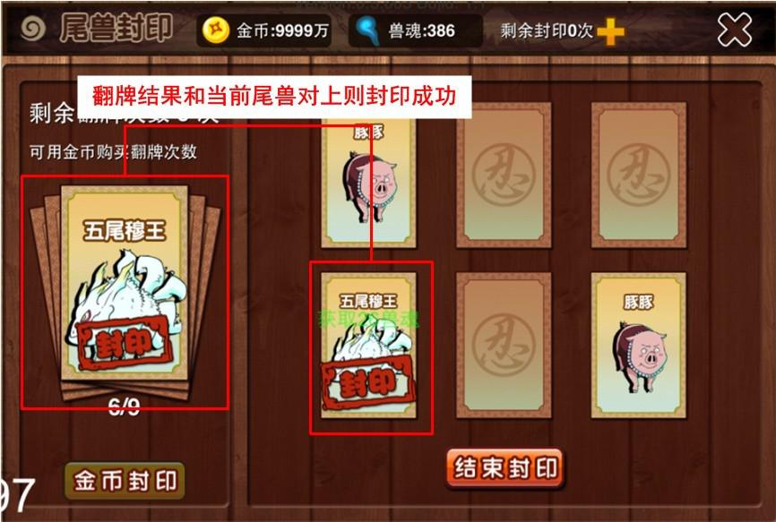 相比漫画中单纯提高封印者的能力,《忍者来了OL》中的尾兽功能性更为丰富。主角等级达到50级后,尾兽封印系统解锁开启。通过尾兽封印,每名角色每天拥有两次封印机会,每次封印都会经历从一尾到九尾的封印流程,在封印过程中有9次翻牌次数。在右边翻牌区域中翻出当前封印尾兽一致的卡牌,视为封印成功。通过封印尾兽,可以获得兽魂、阅历、银两、声望和金币奖励。其中兽魂是尾兽封印系统的特有资源,消耗兽魂可以提升主角和伙伴的生命值,让你真正化身成为“人柱力”!