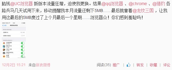 因为浏览器坑爹,这位网友在11月的最后一周发现流量仅剩5MB,于是本着破罐子破摔的心理,玩起了手机网游。最后却意外发现《龙纹三国》超省流量,5MB玩到11月结束都没用完。