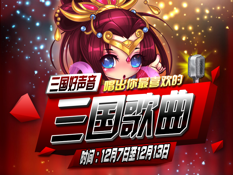 1、12月7日至12月13日期间,只需秀出你的歌声,任意翻唱三国类的歌曲,即可参与“【三国好声音】唱出你最喜欢的三国歌曲“活动。