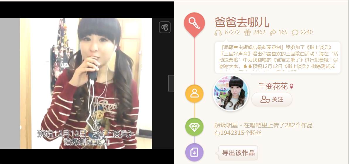 清纯的外表,甜美的声音,千变花花翻唱的三国版《爸爸去哪儿》一经发布,便吸引了无数宅男腐女的围观。改编的搞笑歌词,更突出了《指上谈兵》一圈一划,打破卡牌无脑点点点,区别其他卡牌游戏的特殊玩法。《指上谈兵》独创的即时战斗系统,派出什么武将都是由玩家即时决定的,发动攻击的时间、攻击目标、技能使用和释放时机也由玩家自行决定,可随时改变攻击目标和攻击策略。在一圈一划间战局便由玩家自己尽情掌握!就如我们喜欢哪个唱吧美女,就会愿意去点击支持一样。
