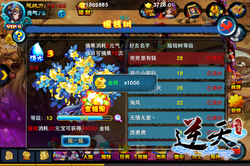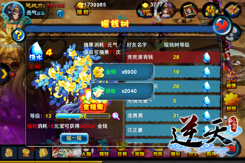 顾名思义,摇钱树是可以不断地生长铜钱,摇一摇就有大量的铜钱掉进我们口袋的金钱树。在《逆天仙魔录》中,每人每天有6次的摇钱次数与20次的摘果次数。每次摇钱,就可以将元宝换成金钱,用于强化装备,升级宝石等,但摇钱所需要的元宝会越来越多。摇钱树上挂满了金银果,实在是令人垂涎欲滴。每消耗5元气便可以摘取一个。打开金银果可以获得金钱和经验。