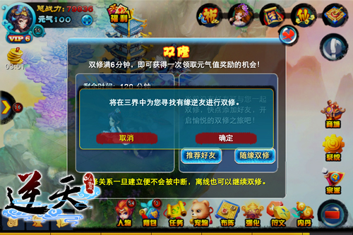 选择随缘双修的话,系统将在三界中为您寻找有缘逆友进行双修,当然这一配对可能是同性的,也可能是异性的,但只要你真心结交,必能成为好友,若是异性,说不定还能与你成就美好姻缘,造就一段传世佳话。