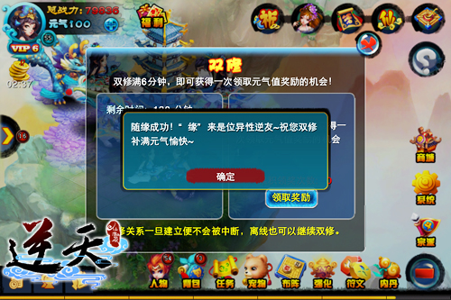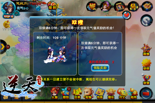 当你开始进入双修界面准备双修之时,系统会提示你剩余时间120分钟。同时,每6分钟可以领取一次元气,总共20次。当双修完成后,游戏将会提示你完成了双修,请尽快领取你的奖励,否则每日0点将会重置奖励。