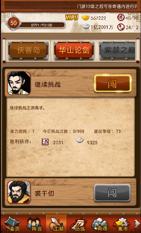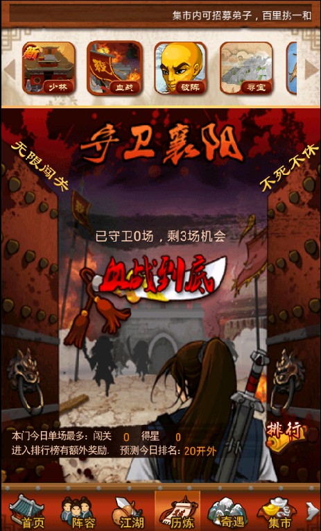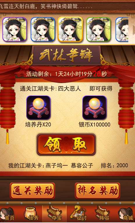 本次闯江湖玩法升级除加入排名玩法外,同时还加入了固定江湖关卡过关奖励。玩家只需打通指定关卡(当然会有一定的难度哦!),即可领取奖励,攻坚之战,真男儿血拼,掌门敢来么?