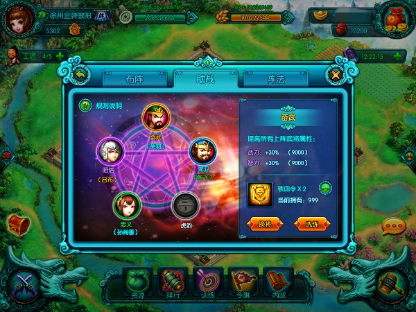 《新三国》校场已有布阵系统,有没有感觉尽管我们可以布出各种阵,可是实际上的效果没有多大,新版本中将会新增助战功能。在新版本中将会提供5个助战栏位给玩家使用,助战栏位都有相应的助战属性。在该栏位可通过设置非上阵武将作为助战武将,为所有上阵武将提供助战栏位对应的属性加成。