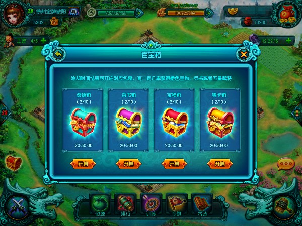 百宝箱呢百宝箱,那里面会是什么呢?新版本新增百宝箱活动,可有4种不同冷却时间的百宝箱,冷却时间结束时可以开启百宝箱获取对应奖励。除了获得常规的资源和道具奖励之外,最高可获得:武器、护具、兵书包、宝物包、碎片包和将卡包等橙色物品。
