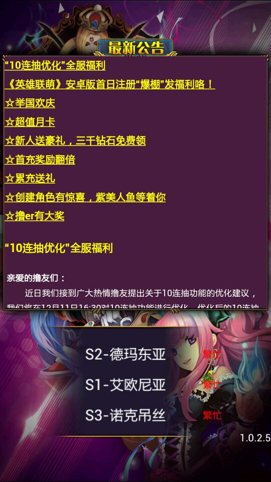 由成都掌娱天下500万独代的卡牌类RPG手游《英雄联萌》于12月10日正式登陆国内安卓市场,联合国内9大安卓应用平台联合发布游戏;上线当日接连被玩家爆服,官方紧急连开3服以保证玩家能正常游戏。