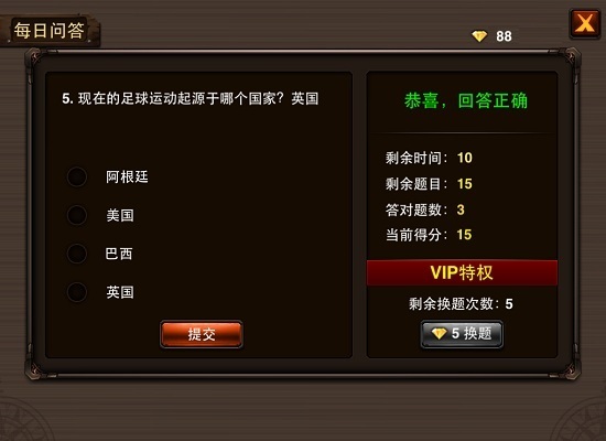 在答题玩法中,还有一项特权功能,不过目前只对《格斗之皇》的VIP玩家开放。遇上不会的题目,使用该特权,就可以由系统为你更换一道新的题目,想想还有点小兴奋呢。还不是VIP的小伙伴们,是不是有点心动了呢?