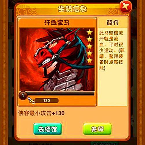 在8090手游《比武招亲》中,坐骑可是相当重要的,因为它让你在侠客对等的情况下,依旧可以略胜一筹。在8090手游《比武招亲》中要全面发展才能所想披靡,侠客、武器、防具,秘籍,坐骑,一个都不能少!坐骑如果培养的好,能让你的阵容实现质的飞跃哦!在8090手游《比武招亲》中,汗血宝马是五星级坐骑,给侠客增加最小攻击。未强化时给侠客增加130的最小攻击,看起来数值比较小,但是强化并转生后的数值还是比较惊人的,具体大家可以自己去游戏中体验。汗血宝马对于鳌拜以及郭靖来说,是必不可少的,因为可以点亮他们的技能,使他们的攻击得到一定的加成!