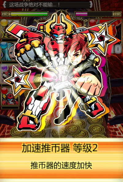 玩家在选择执行任务的时候,会驾驶造型酷似推币机的飞船在不同的冒险区域穿梭。在飞船左侧会罗列出玩家设置参战的战斗卡组,一旦在冒险过程中遭遇敌方来袭,你就需要通过在推币区推落金币的方式来获得卡牌自动攻击的机会,连续推落金币的话,战斗卡牌还会获得连击加成的特效!需要注意的是,只有从正下方JACKPOT的位置推落的金币才会增加攻击机会,并可再次获得。从船身两侧掉落的金币或物品则会白白损耗,所以,要尽可能的避免金币从两侧掉落。
