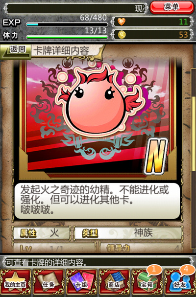 玩家获得的卡牌大致有三类,普通卡牌、BOSS卡牌以及元素卡牌。同时,所有卡牌还有火、木、水、光、暗五种属性之分。你可以通过吞噬卡牌的方式来强化普通以及BOSS卡牌。要注意的是,必须吞噬同属性的卡牌,你所培养的卡牌才会获得较好的成长,但是切忌用元素卡牌来培养你的主力战斗卡牌。因为稀有的元素卡牌可以用来“进化”战斗卡牌!当战斗卡牌通过强化方式达到满级后,就可以搭配一张同类卡牌和元素卡牌来进行“进化”操作,进化后的卡牌不仅会获得更强大的技能,卡牌的牌面图案也会有所变化哟!而越强大的卡牌,就拥有越强大的战斗力,当你执行任务遭遇敌人和BOSS的时候,他们就是你最强大的战士!