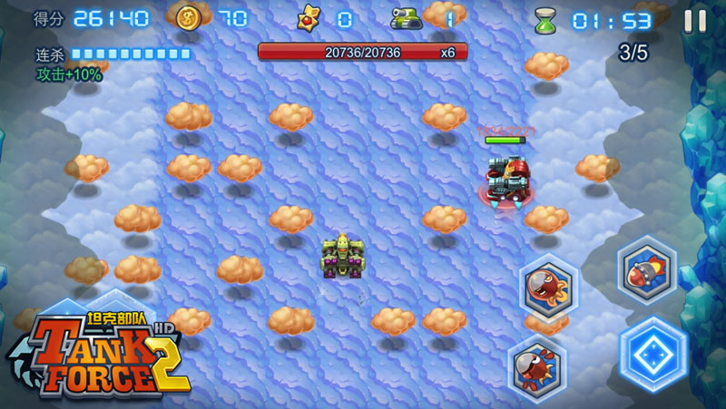 《坦克部队2》的云中城作为最终场景,竟然将坦克的战场搬到了云层之中,场景中也添加了带雷电的黑云、云洞等很有特色的元素。这个场景中的坦克主要分为两种,一种是像小鸟一样撞来撞去的小不点,它们会向你急速冲来,被撞到就会眩晕几秒钟。另一种是带有恐怖钻头的坦克,它们的拿手好戏是发射混乱弹,让坦克不受控制乱跑,如果被混乱弹打中,不幸走到了云洞之上,后果不堪设想!