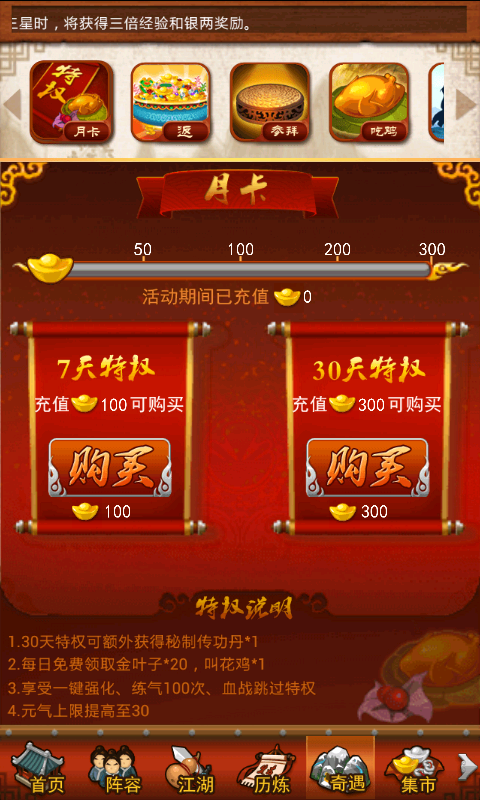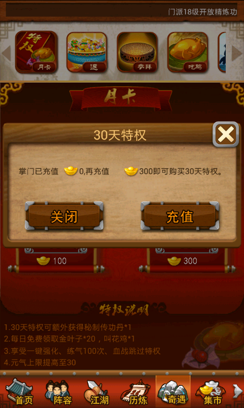 《大掌门》月卡一共分为两个级别,玩家累计充值大于100元宝小于300元宝时可获得购买7天月卡的权利,累计充值大于300元宝时获得购买30天月卡权利。玩家购买”月卡“后立刻获得相关月卡特权,并开始计算剩余时间,每次只能选其一购买。