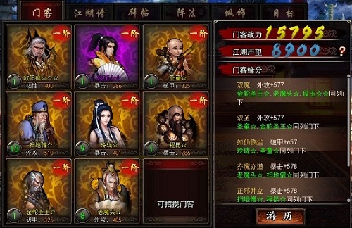 《格斗江湖移动版》中门客都有着丰富的江湖阅历,他们之间也有着各自的缘分羁绊。例如,常胜法王与白雕在江湖上并称“西域白绝”,大嗔和尚与大痴和尚并称“嗔痴之佛”,如果把这些有缘份的名人共同收做门客,那么他们能为玩家提供更多的额外属性加强。缘分有善缘也有孽缘,像扫地僧和程昆这一正一邪两位巨头同列门下,为玩家带来“暴击+578”的额外属性!