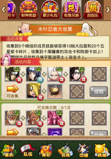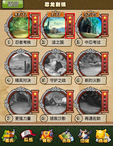等级上去了,队伍的位置就开得越多,多一个忍者上阵,加起来的战力自然也就高了,而这个时候就可以在国战跟竞技场中崭露头角,每晚记得参加国战,而获得的功勋前期最好换武器和装备。至于元宝的使用,最好就是先转财神,接着拿一大部分来转轮盘,这样的好处就是可以转出很多紫忍碎片、高级仙石、紫装备忍术,如果运气好当然还有更好的紫卡。