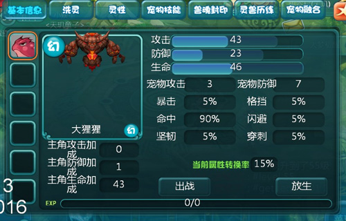 宠物信息界面:显示宠物的各项属性以及控制宠物出战状态;