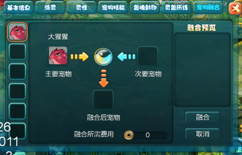 宠物融合界面:玩家可以通过该界面将一只宠物的等级,灵性等级转移给另外一只宠物。