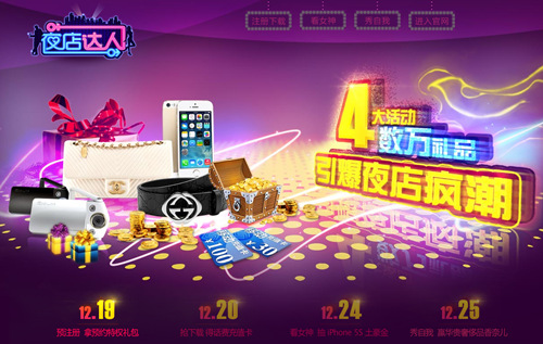 预注册拿预约特权礼包,喇叭、时装、许愿卡人人有;抢下载得手机充值卡,话费流量我们包;看女神抽iPhone5S土豪金,女神跟我做朋友;秀自我赢奢侈品,引领夜店新疯潮。四大活动一气呵成,百万礼品给大家带来最刺激的岁末狂欢,《夜店达人》期待大家的参与!