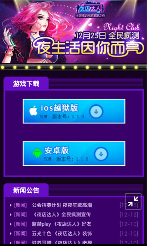 广大玩家现在可以用手机尽情访问官网,今后下游戏,看资讯更方便,体验更舒适、更人性化的手机阅读体验。敬请关注我们的新闻动态,让我们共同期待12月25日《夜店达人》全民疯测!