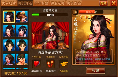 要知道这个世界上最大的嫖客可不是在妓院啊,那是在皇宫啊,各朝皇帝嫖的那叫一个名正言顺,各色女子,争妍斗艳,香艳不断啊!8090app《风云天下》中,秀女之间的竞争也是相当激烈的,怎么才能更快的对秀女进行升级。其实秀女可以通过微服选秀选出秀女,选出来的秀女等级和品质都不尽相同,那么如何升级秀女呢?