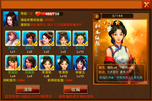 还有第二种升级方式:秀女通过收编其它秀女来升级。通过收编升级消耗掉被收编的秀和一些隐蔽,同时完全继承被收编秀女的经验。秀女升级后提供的属性加成也会相应的提升,星级越高升级后提升的属性就越高。不过所有星级秀女升级所需要的经验是相同的,玩家册封秀女时要选择高星级的秀女哦!