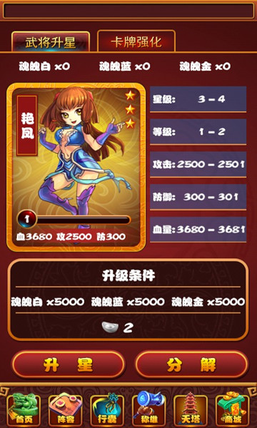 在经历江湖奇遇,随机宝箱之后,居然获得强力卡牌,可不能白白给浪费了。在《隋唐天下》,你可以通过武将升星,将你喜欢的英雄角色随意DIY,创造出你喜欢的样子。只要你的强力英雄的星级没有达到5级,你就可以在达到一定条件之后,去变身它们。当然,你需要消耗一些东西:魂魄白,魂魄蓝,魂魄金。不过,无须担心,通过游戏你可以轻松拿到这些材料哇。