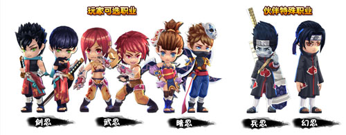 游戏初始,玩家可以有剑忍、武忍和暗忍三个职业可供挑选。三个职业分别对应高格挡、高闪避和高暴击的职业特点,并且可以利用各自职业特性转化额外的查克拉能量。在小伙伴的选择方面,除了上述三种职业之外,又加入了兵忍和幻忍两大特殊职业,以满足玩家丰富游戏战术的需要。
