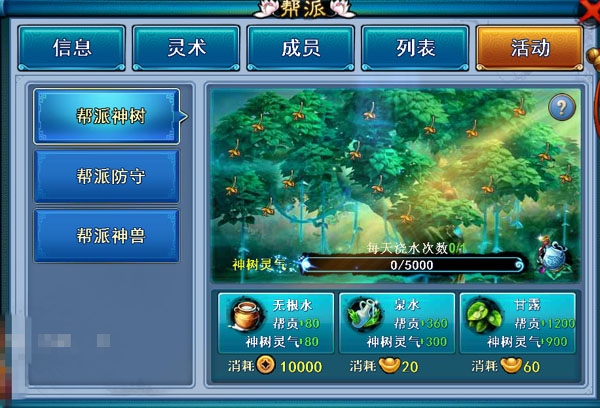 一个篱笆三个桩,一个好汉三个帮。帮派近日喜添圣物神树,仙友们只需每日浇灌一次神树,不仅能提升帮派贡献获得奖励,而且能得到神树果实的恩赐,内含真气果、道具果、经验果及铜钱果多种丰富奖励。