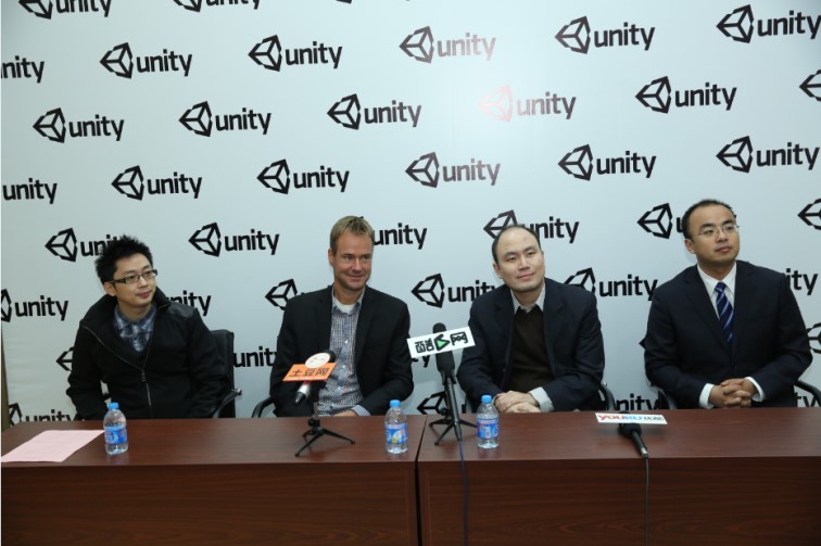 -左起:墨麟集团CEO周志锋,Unity 全球COO&CFO Henrik Nielsen, -Unity全球COO&CFO Henrik Nielsen 出席会议并致辞Unity大中华区总裁符国新,天津九胜投资副总经理马磊 接受媒体采访