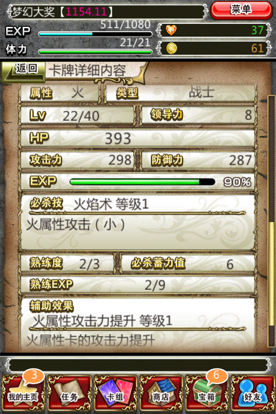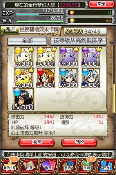 最后,大家应尽量平衡上阵卡牌的等级,最好别让卡牌间的等级差过大;因为战斗时,卡牌是由上至下依次发动攻击,若有卡牌等级过低而导致对BOSS的伤害不给力,那就白白浪费一次攻击机会了。