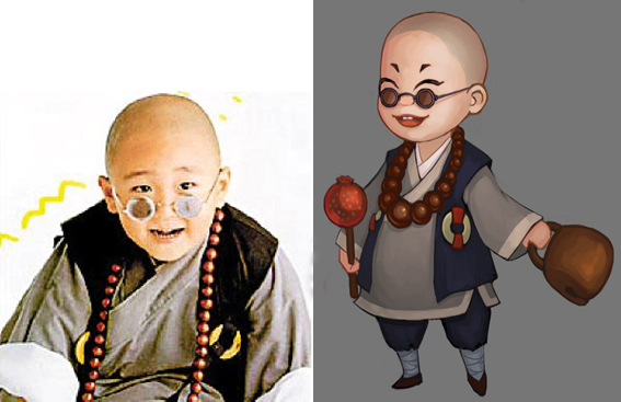 是否曾记得《旋风小子》中的小皮吗?那个胖呼呼,手里总是拿着游戏机说别人笨的小p孩。《小师妹》里也设定了这样一个护寺小僧,一副小墨镜外加八字眉,还有一对八哥牙,十分符合形象,真是圆圆小光头,天天小馒头。